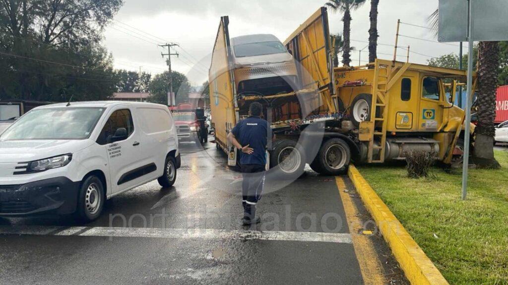 Un tráiler nodriza que aparentemente circulaba a una velocidad mayor de la permitida, derrapó sobre el asfalto mojado por la lluvia, derrapó, chocó contra la retaguardia de una camioneta y acabó estrellado contra una palmera del camellón central del Periférico Paseo de la República, Sector Independencia, hecho que sólo dejó daños materiales.