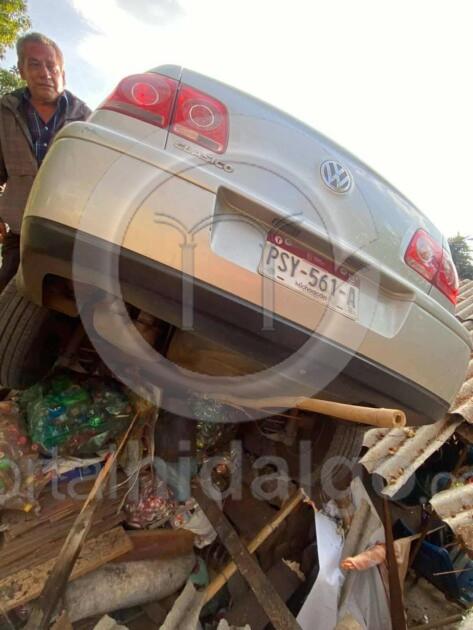 Zitácuaro, Mich.-Un automóvil cayó desde lo alto de una vialidad hacia un desnivel y terminó siniestrado sobre la techumbre de un domicilio ubicado en la colonia Pueblo Nuevo de esta ciudad.