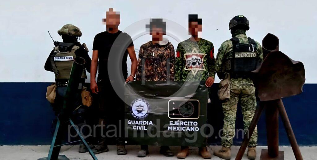 Apatzingán, Mich.-Tres presuntos integrantes de una célula delictiva fueron detenidos por Fuerzas Federales y Estatales, tras un enfrentamiento en la zona cerril de Apatzingán. A los sospechosos les fueron incautadas armas, dos mortero, droga, vehículos y diverso armamento.