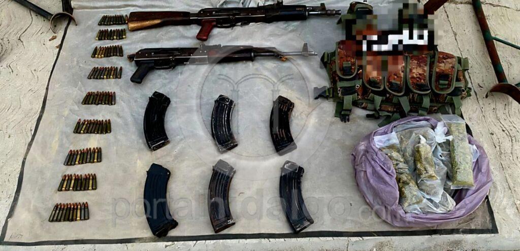 Además, los policías y soldados aseguraron en el área 2 armas largas, equipo táctico, 90 cartuchos, 6 cargadores, aproximadamente medio kilo de mariguana, dos morteros artesanales para lanzar explosivos improvisados, así como una camioneta Cheyene de color blanco y una Suzuki Jimmy de color gris, utilizadas por los generadores de violencia.