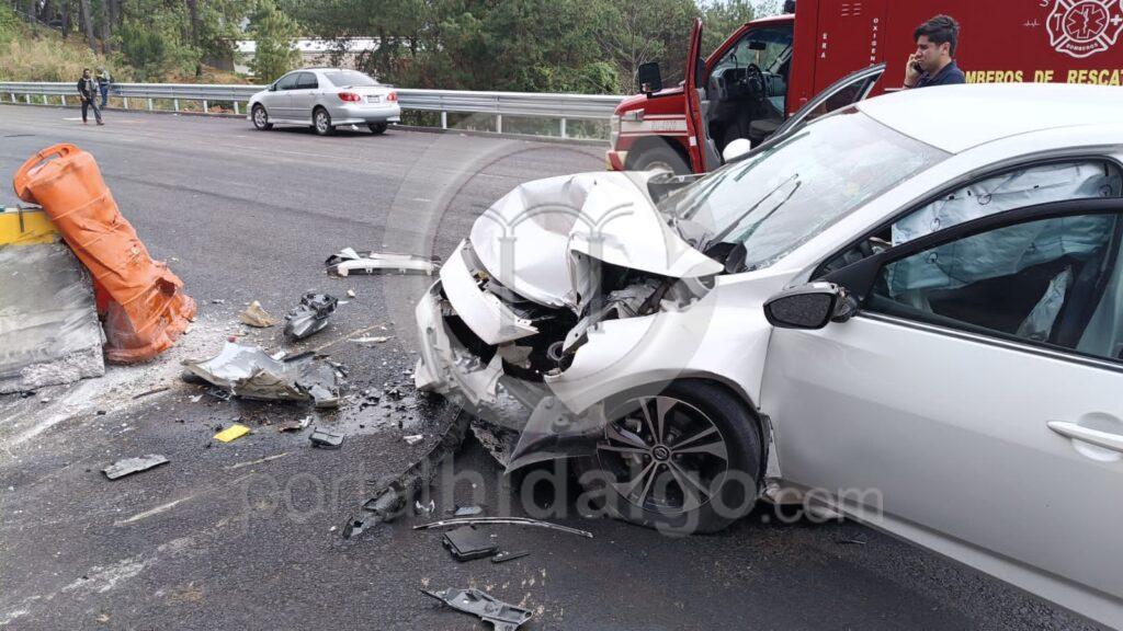 Posteriormente, un auto compacto de color blanco, choco contra el muro de contención en el kilómetro 79+000, del tramo Zirahuén – Uruapan, resultando su conductor con lesiones graves.
