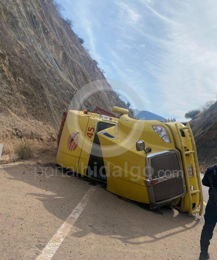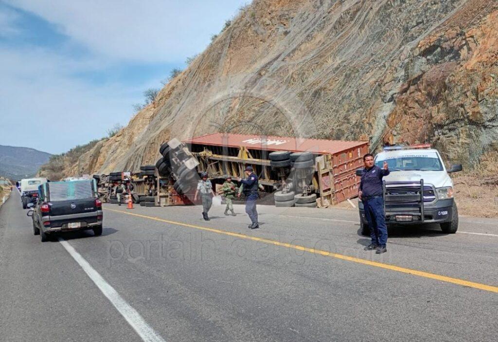 Primeramente, en el kilómetro 231 del tramo carretero Las Cañas – Feliciano, un tráiler de color amarillo, con número económico 45, volcó junto con sus dos remolques, sobre su costado derecho, obstruyendo parcialmente la circulación, sin que se reportaran personas heridas.