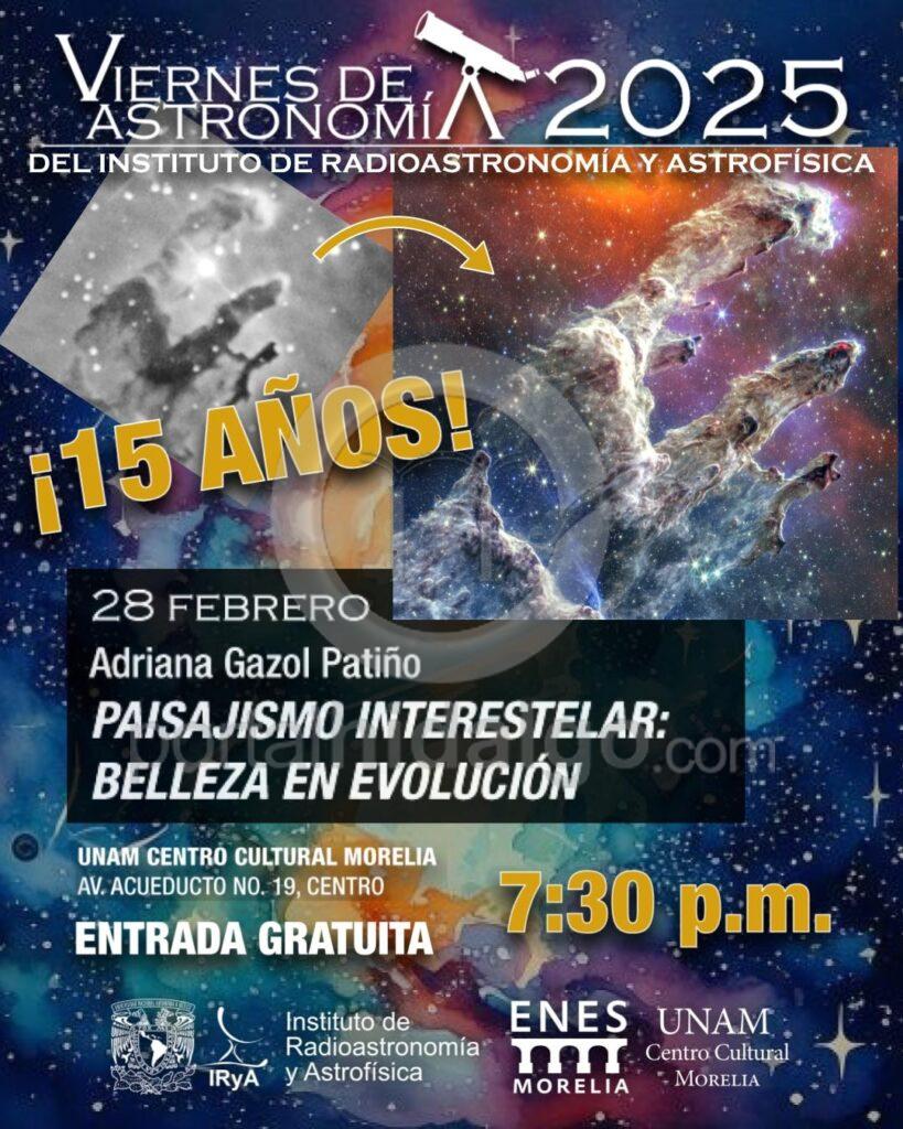 El Viernes de Astronomía del Instituto de Radioastronomía y Astrofísica (IRyA) de la UNAM, Campus Morelia, cumple 15 años este 2025, y lo festejamos con tres pláticas en las que exploraremos qué tanto hemos aprendido sobre el universo en este tiempo.
