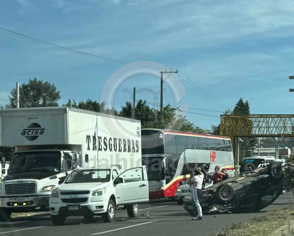 La volcadura de un automóvil compacto generó movilización de los cuerpos de emergencia sobre la carretera Morelia-Salamanca, a la altura de la embotelladora Aga y la colonia Los Ángeles en la ciudad de Morelia.