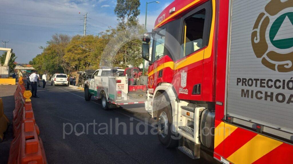 El percance se registró durante la tarde de este domingo, a la altura de las obras del nuevo Distribuidor Vial de la Salida a Pátzcuaro, cerca de las colonias Hermanos López Rayón y Xangari. Varios automovilistas reportaron la situación al número de emergencias 911, por lo que al lugar acudieron patrulleros de la Guardia Civil y bomberos estatales.