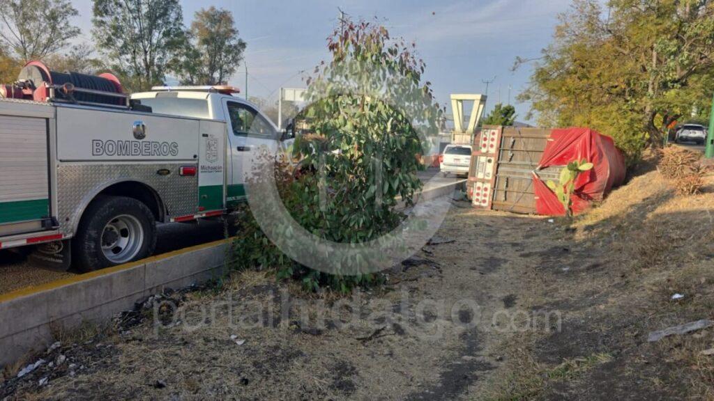 Un camión tipo torton que transportaba maíz volcó sobre la Calzada La Huerta, en la ciudad de Morelia. Por fortuna el accidente no dejó heridos ni fallecidos, informaron autoridades policiales y de rescate.