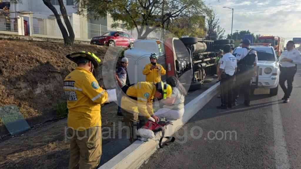 Los rescatistas atendieron a dos adultos y un adolescente que viajaban en la unidad, quienes resultaron ilesos y no requirieron traslado hospitalario. El vehículo es de la marca Freightliner, color blanco, con matrícula NS4819B.