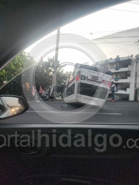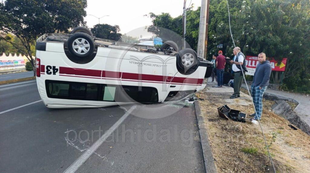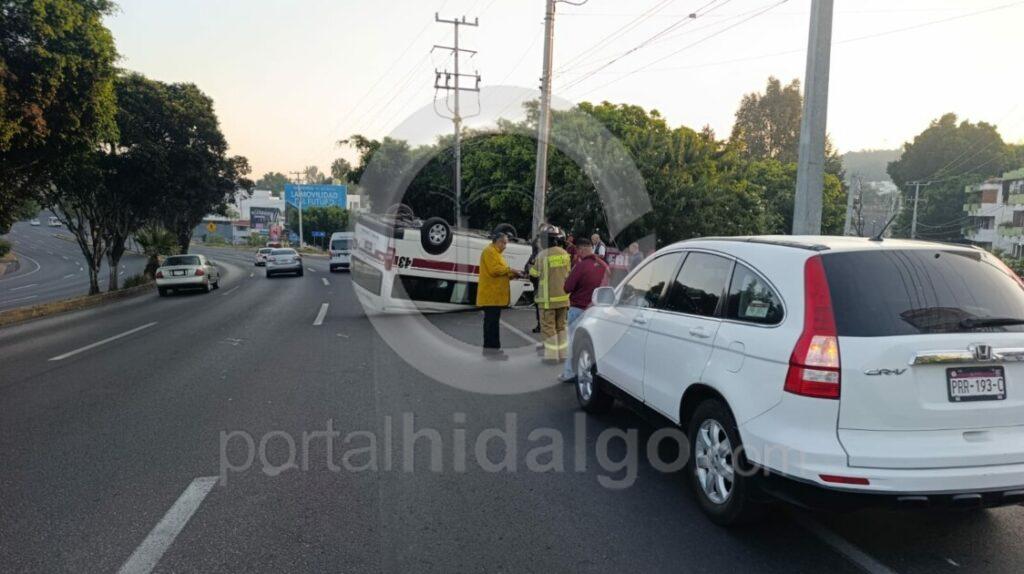 El aparatoso incidente se registró en el sentido de Fuentes de Morelia hacia Casa Michoacán, donde terminó volcada una camioneta de la Ruta Guinda, con número económico 43.