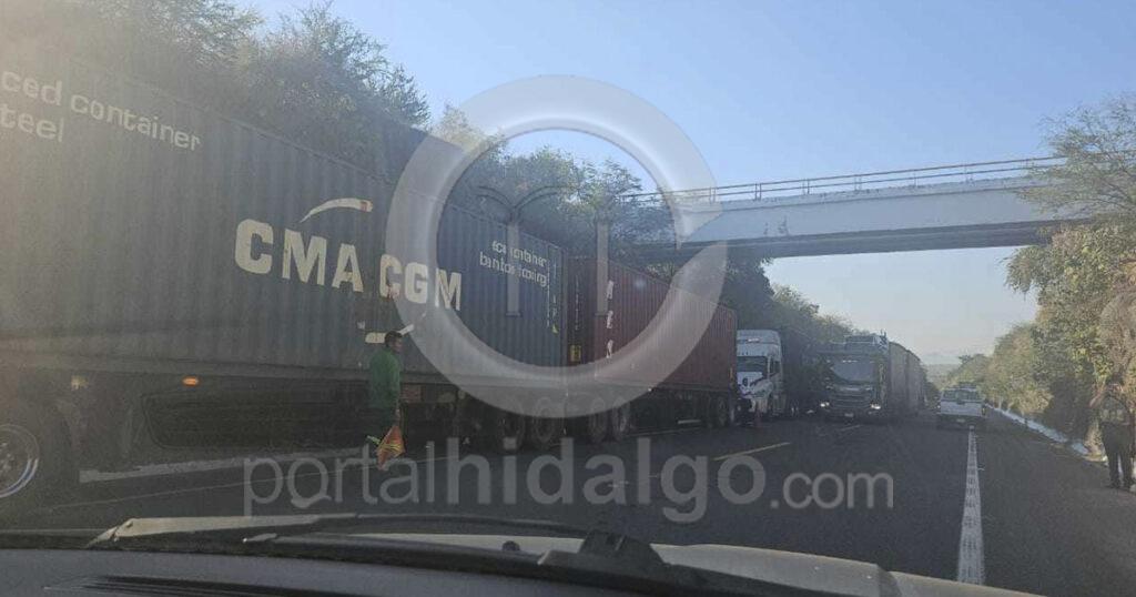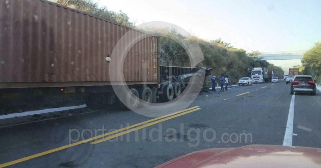 Gabriel Zamora, Mich.-Uno de los dos contenedores que era remolcados por un tráiler acabó volcado sobre la acotamiento en la autopista siglo XXI, sin que se reportaran personas heridas.