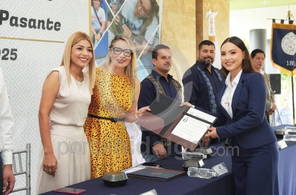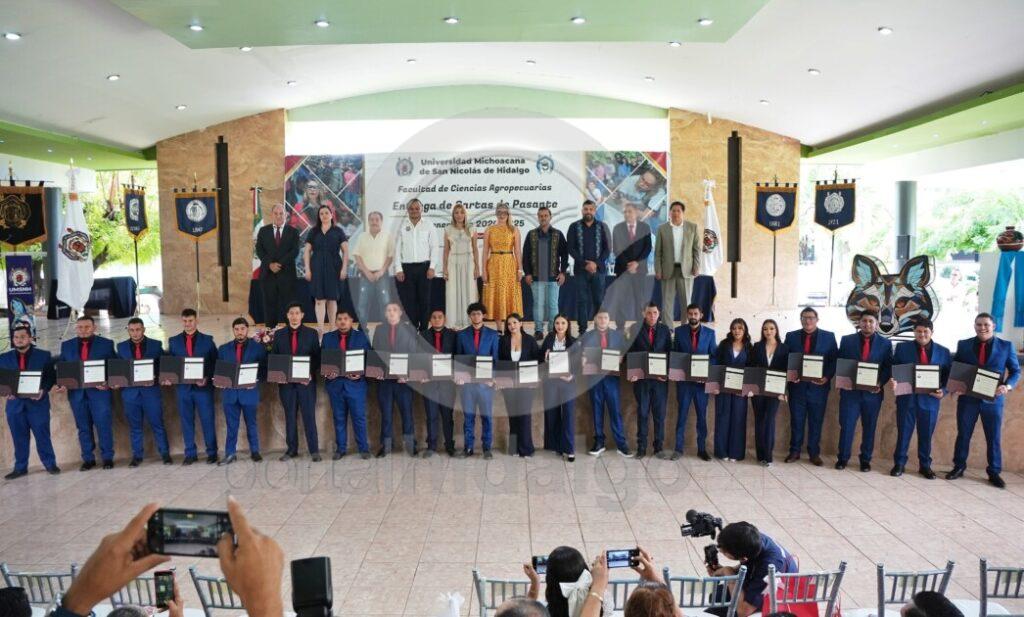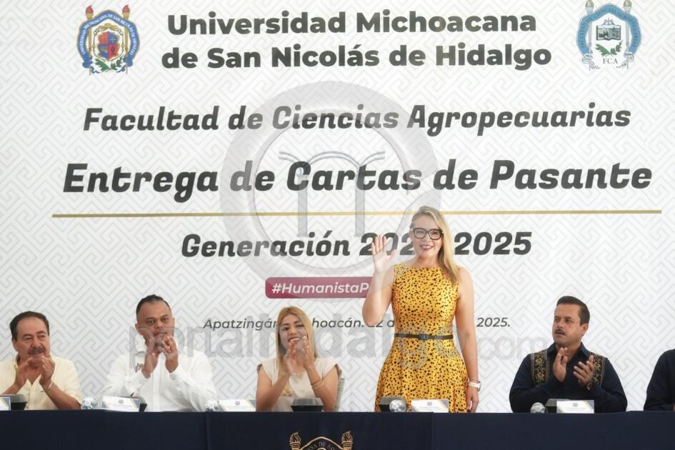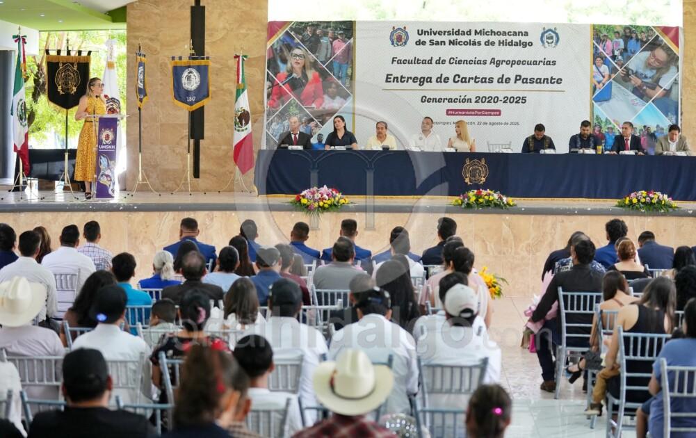 Apatzingán, Mich.-Con el compromiso de impulsar la Facultad de Ciencias Agropecuarias ubicada en el municipio de Apatzingán, la rectora de la Universidad Michoacana de San Nicolás de Hidalgo (UMSNH), Yarabí Ávila González, hizo entrega de cartas de pasante a egresadas y egresados de las Licenciaturas de Ingeniero Agrónomo Horticultor y de Administración de Empresas.