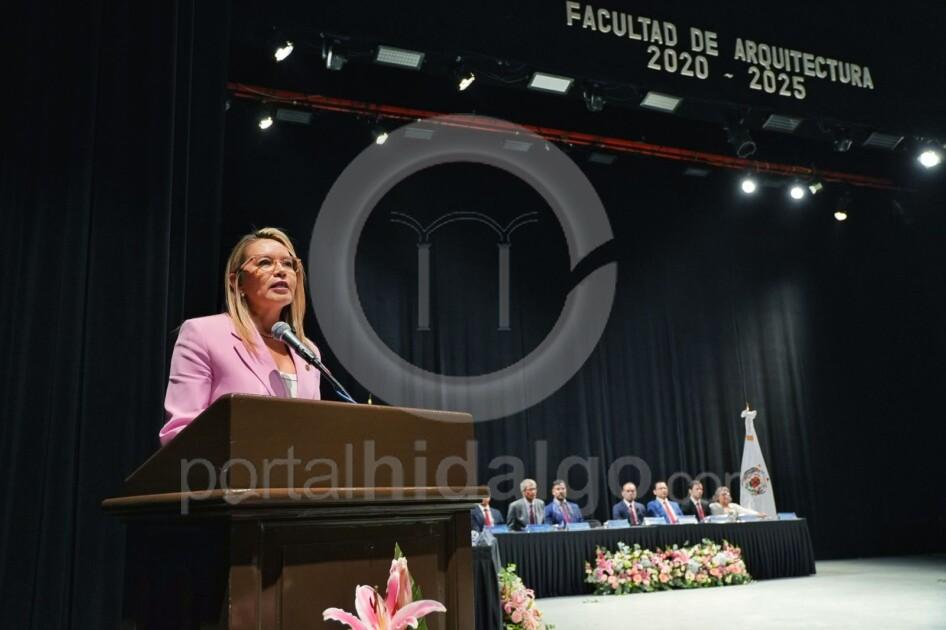 La rectora manifestó su satisfacción por acompañar a las y los egresados en este momento tan especial, tras señalar que durante el camino seguramente hubo momentos de presión, de horas frente a planos pero también de alegría y compañerismo, de descubrir que la Arquitectura no solamente es una carrera, sino es una manera de transformar el mundo y de transformar y dignificar los espacios.